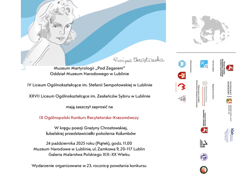 w imieniu Dyrekcji Muzeum Narodowego w Lublinie i Muzeum Martyrologii „Pod Zegarem” na finał IX Edycji Ogólnopolskiego Konkursu Recytatorsko-Krasomówczego „W kręgu poezji Grażyny Chrostowskiej, lubelskiej przedstawicielki pokolenia Kolumbów”, który odbędzie się w dniu 24 października (piątek) 2025 r. o godz. 11:00 w Galerii Malarstwa Polskiego XIX i XX Wieku na Zamku w Lublinie.
