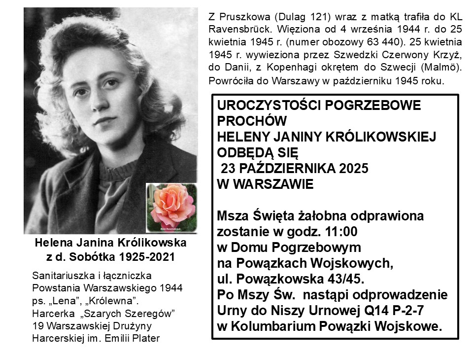 Helena Janina Królikowska zmarła 3 marca 2021 r. Była harcerką Szarych Szeregów, sanitariuszką i łączniczką w Powstaniu Warszawskim 1944 r. ps. „Lena”, „Królewna”. Do KL Ravensbrück gdzie trafiła wraz z matką Marianną Sobótka we wrześniu 1944 i była więziona do kwietnia 1945 r.