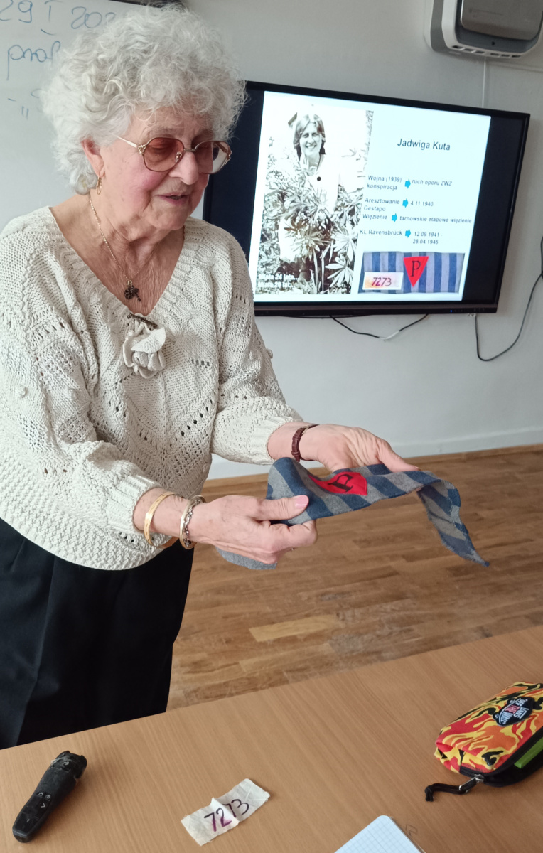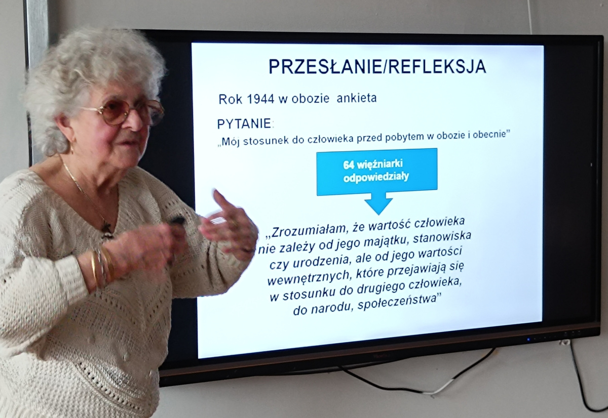 Tym świadkiem była prof. Elżbieta Kuta, córka Jadwigi Kuty – więźniarki obozu Ravensbrück.Refleksje młodzieży oscylowały wokół pytań: – Czego nauczyło mnie spotkanie z córką więźniarki? Dlaczego musimy pamiętać?