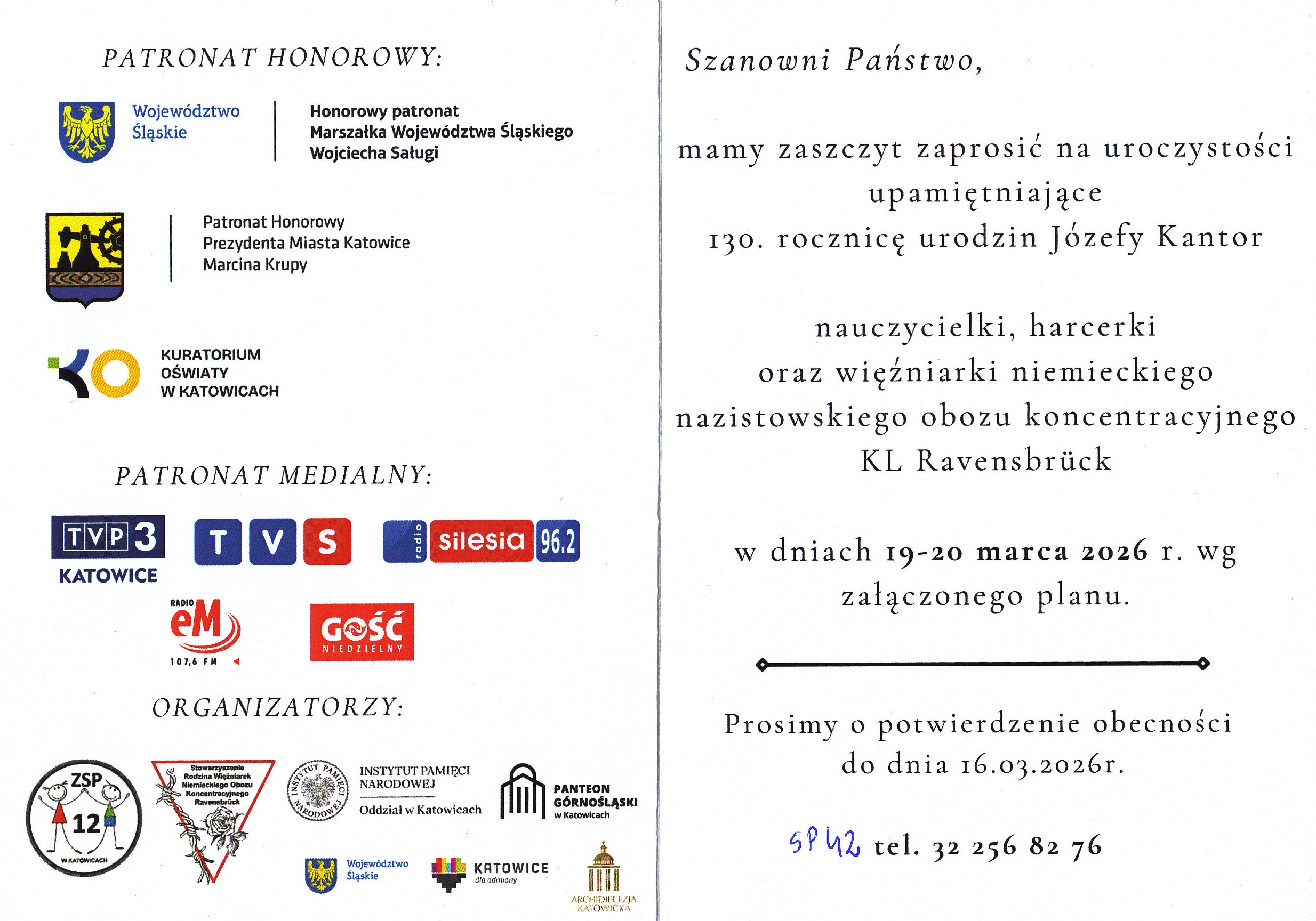 Uprzejmie prosimy o potwierdzenie uczestnictwa do 16 marca 2026 roku nr tel.: 32 2568276